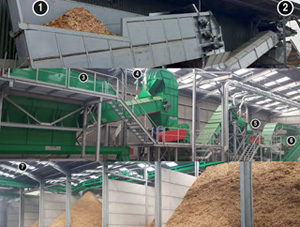 Para dar solución a esta necesidad, HAAS suministró una línea de procesamiento de madera de desecho “llave en mano”. El material ya triturado previamente se reduce al tamaño requerido con el molino de martillos HAAS modelo ARTHOS 1600-E. Posteriormente la madera pasa por separadores magnéticos y separadores no ferrosos y finalmente se separe en cuatro tamaños diferentes con una cribadora plana de HAAS.